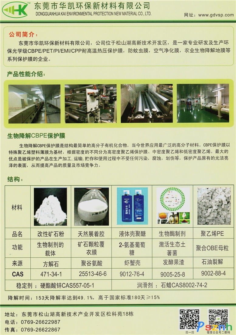 東莞市華凱環保新材料有限公司 環保光學級PE/PET/PI/EMI/CPP耐高溫熱壓保護膜_防蚊蟲膜_空氣凈化膜_農業生物降解地膜點擊:514 查看原圖![]() ![]() ![]() 東莞市華凱環保新材料有限公司