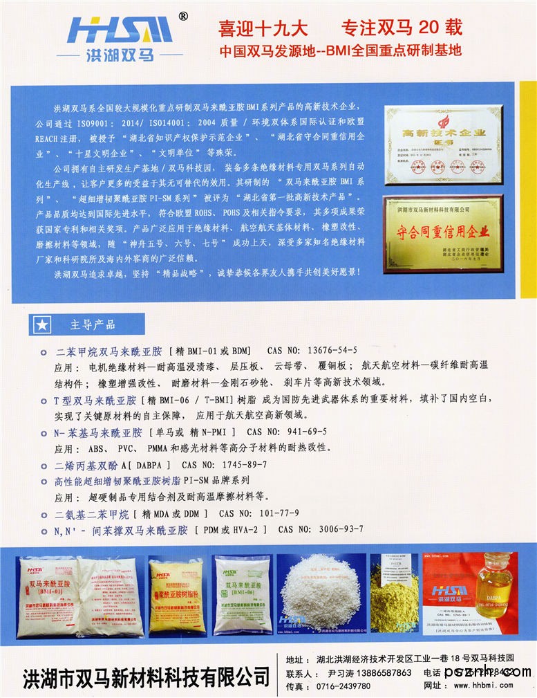 | 經(jīng)營范圍: | 雙馬來酰亞胺系列產(chǎn)品、絕緣耐磨材料、橡膠塑料材料增強劑制造、銷售;新材料技術的咨詢服務。(涉及許可經(jīng)營項目,需取得相關部門許可后方可經(jīng)營) | ||