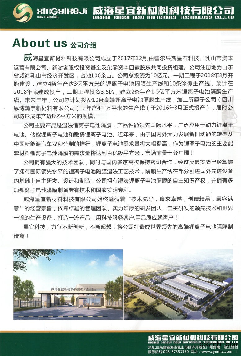 威海星宜新材料科技有限公司 濕法鋰電池隔膜_鋰離子電池隔膜_高端鋰離子電池隔膜點擊:835 查看原圖![]() ![]() ![]() 山東省威海市乳山市經濟開發區廣州路南、湛江路西