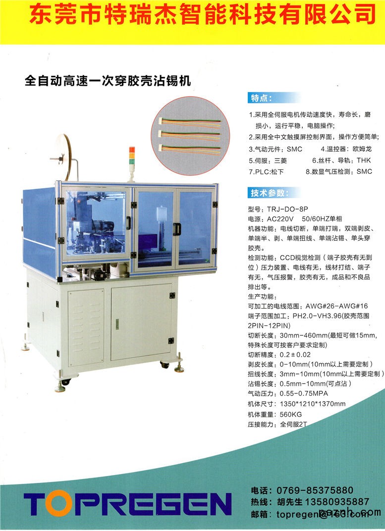 東莞市特瑞杰智能科技有限公司 全自動單頭沾錫機、全自動排線端子機、全自動打端子穿膠殼機點擊:922 查看原圖![]() ![]() ![]() 客服電話:0769-85375880