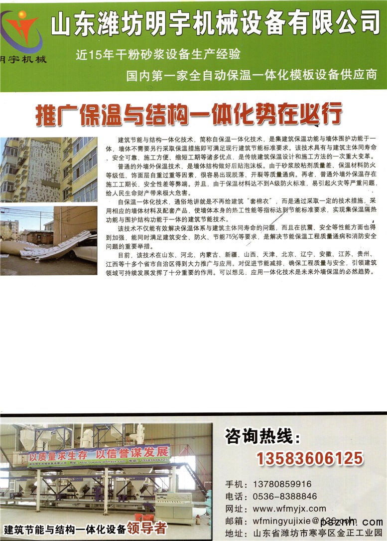 濰坊明宇機械設(shè)備有限公司 外墻保溫砂漿生產(chǎn)線 砌筑砂漿全自動生產(chǎn)線 自流平砂漿專用生產(chǎn)線點擊:581 查看原圖![]() ![]() ![]() 部 門:銷售部手 機:13583606125電 話: 0536-8388846傳 真:0536-8388847網(wǎng) 址:http://www.wfmyjx.com地 址:山東濰坊寒亭區(qū)
