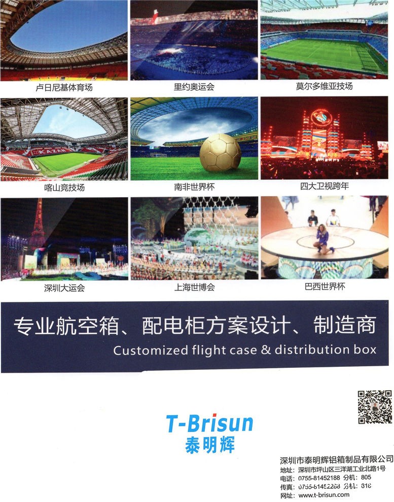 目前,泰明輝產品遠銷歐洲、美洲、亞洲、大洋洲等全球多個國家和地區,已和諸多大型企業進行戰略合作,且多年來被諸多客戶評選為“優秀供應商”、“最佳品質供產商”。 泰明輝將繼續執著創新、追求卓越,為全球視聽領域的用戶提供更安全、便捷的航空箱、配電柜產品,矢志成為全球視聽領域杰出供應商! 地址:深圳市坪山新區三洋湖工業北路1號 電話:0755-81452188