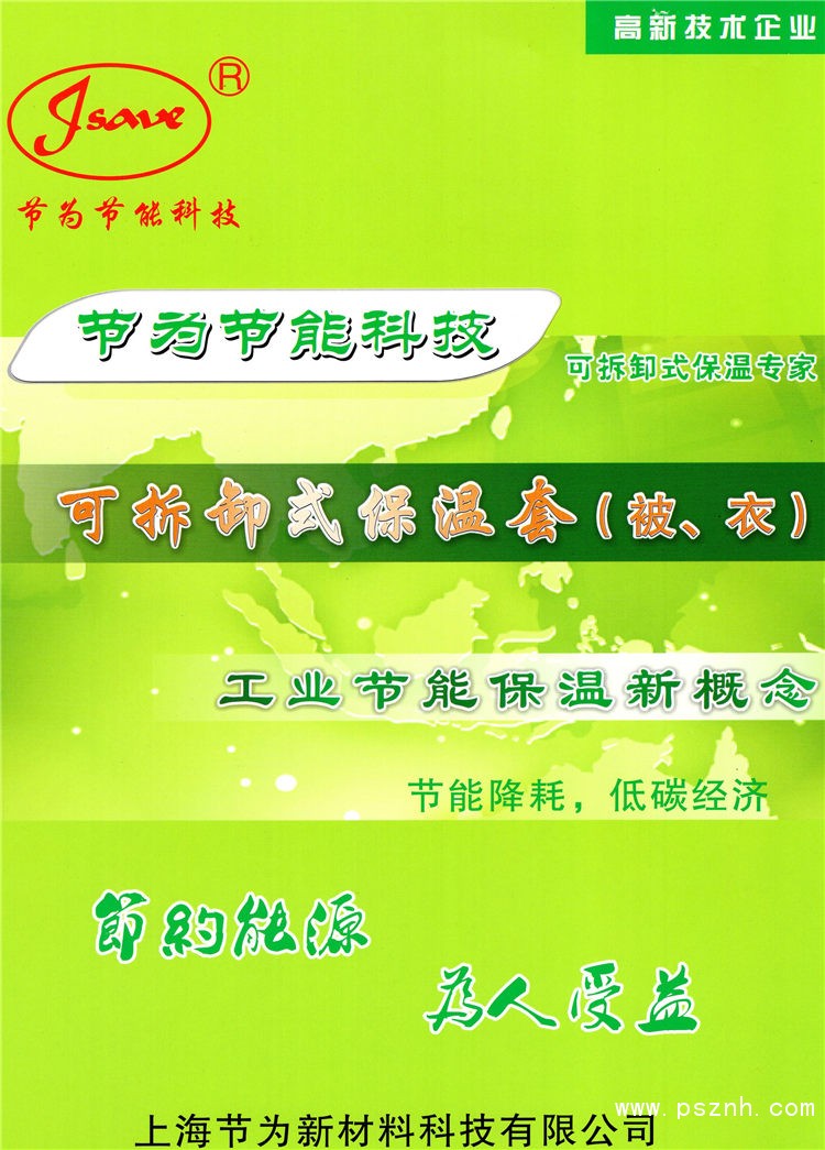 | 公司簡介: | 上海節為新材料科技有限公司是一家從事高溫絕熱產品生產研發的企業,以特殊可拆卸保溫隔熱套、耐高溫隔熱板、特殊保溫絕熱項目工程為主,針對各類熱電、石化、機械制造、塑料工業等工廠客戶,從源頭、過程、回收等環節進行節能工程的研發。