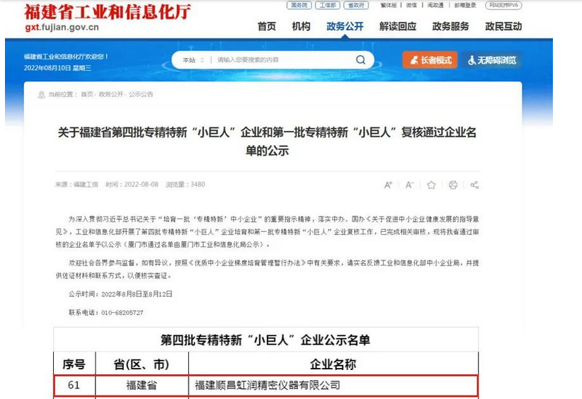 近日,福建省工業(yè)和信息化廳官網發(fā)布了工業(yè)和信息化部第四批國家專精特新“小巨人”通過企業(yè)名單公示,福建順昌虹潤精密儀器有限公司躍然上榜,繼2019年入選福建省專精特新小巨人企業(yè)之后,再獲殊榮。