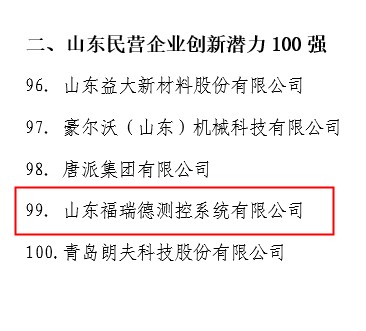近日,山東省工商聯(lián)網(wǎng)站發(fā)布通知通告,公示2022年山東民營(yíng)企業(yè)創(chuàng)新潛力100強(qiáng)入圍名單。福瑞德測(cè)控憑借穩(wěn)健的發(fā)展與扎實(shí)的根基成功入圍。