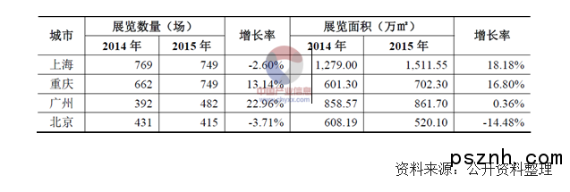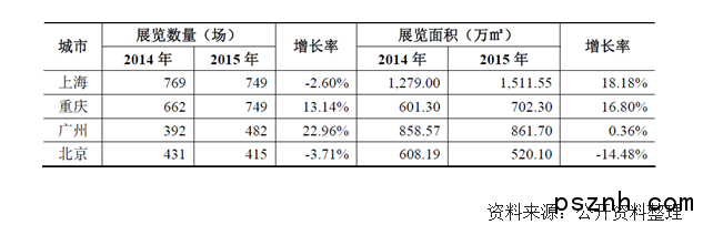 近年來,重慶作為西部中心城市,會展產業積極發展,展覽數量及展覽面積增幅維持在較高水平。2014 年及2015 年北京、上海、廣州和重慶所舉辦的展會數量及展覽面積具體統計如下: