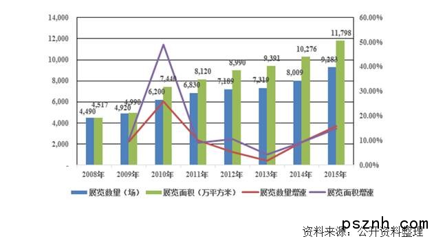 經過十余年的快速發展,我國會展業已初具規模。2015 年全國共舉辦各類展會9,283場,展覽面積11,798 萬平方米,會展經濟直接產值達到4,803.1 億元人民幣,約占全國國內生產總值的0.71%,占全國第三產業增加值的1.41%。2008 年至2015年,國內會展場次數量和展覽面積均實現了穩步增長,具體情況如下:
