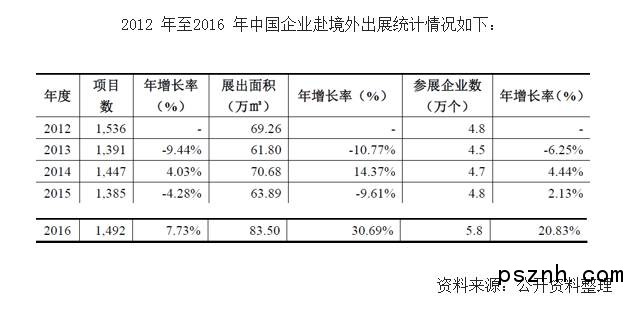 在會展行業總體保持增長的同時,國內會展業相關主體及會展項目層次持續提升。目前,加入UFI 的中國會員和通過UFI 認證的會展項目均已形成一定規模,并集中在北京、上海、深圳、廣州等主要中心城市。2015 年國內UFI 會員數達到95 個,其中北上廣深的會員數量合計達79.85%;通過UFI 認證的會展項目達到46 個,其中北上廣深的會展項目數量合計達59.74%。與舉辦及參加境內展會相比,境內會展企業赴境外自主辦展、境內參展企業赴境外參加國際展會所要求的條件及層次更高。近幾年來,隨著全球經濟的深入融合、中國在國際經濟中的地位提升,中國赴境外自主辦展及參展規模均明顯增長。據不完全統計,2016 年全國97 家組展單位共赴63個國家組織參展1492 項,較上年增加7%;展出面積為83.5 萬平方米,較上年增加14%;參展企業數為5.84 萬家,較上年增加12%。
