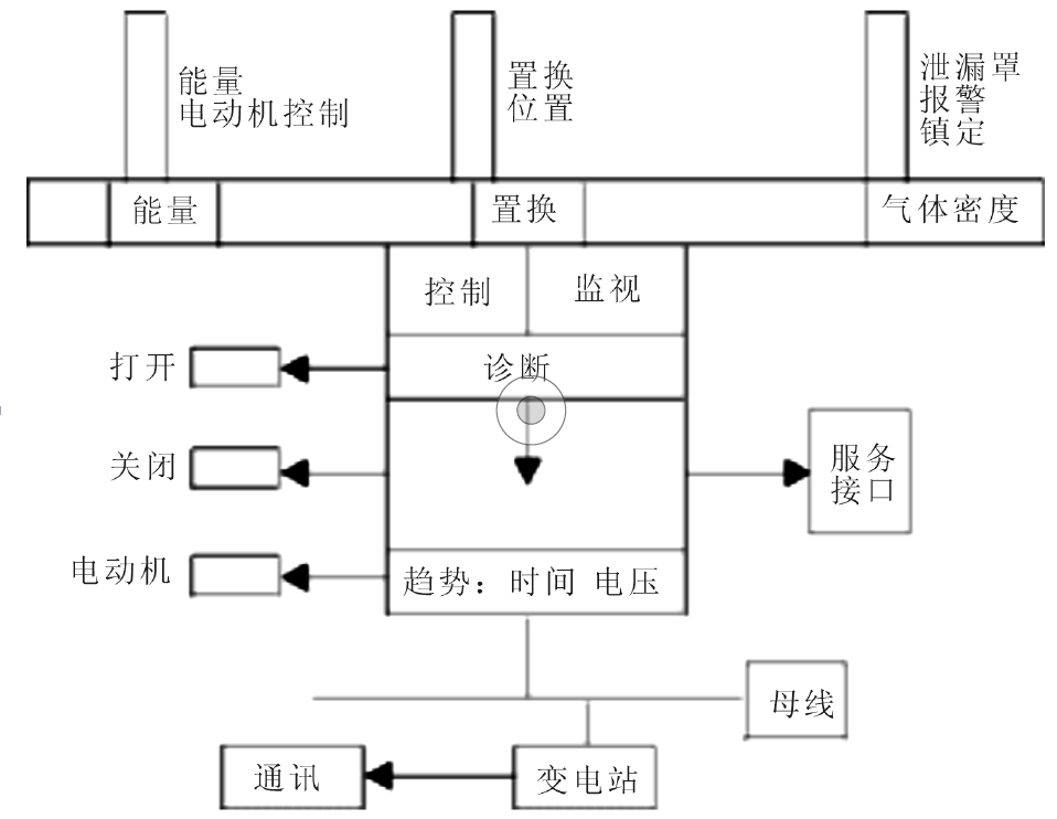 圖1概要說(shuō)明了一種兼有計(jì)算機(jī)系統(tǒng)和傳感裝置的智能化斷路器工作原理。主要的傳感器可探明氣體密度,通過(guò)監(jiān)控其運(yùn)動(dòng)和能量變化,反映操作機(jī)構(gòu)狀態(tài)。氣體密度傳感器發(fā)出的信號(hào)能夠?qū)崿F(xiàn)連續(xù)的狀態(tài)監(jiān)測(cè),確定趨勢(shì)走向以及檢測(cè)極限值,并能在此基礎(chǔ)上實(shí)現(xiàn)常規(guī)的SF6氣體的鎖定和報(bào)警功能。同樣,在運(yùn)動(dòng)傳感器和能量傳感器的幫助下,操作機(jī)構(gòu)的狀態(tài)可實(shí)現(xiàn)監(jiān)控。另外,這些傳感器的信號(hào)可同時(shí)用于常規(guī)的位置指示和電動(dòng)機(jī)控制功能上。