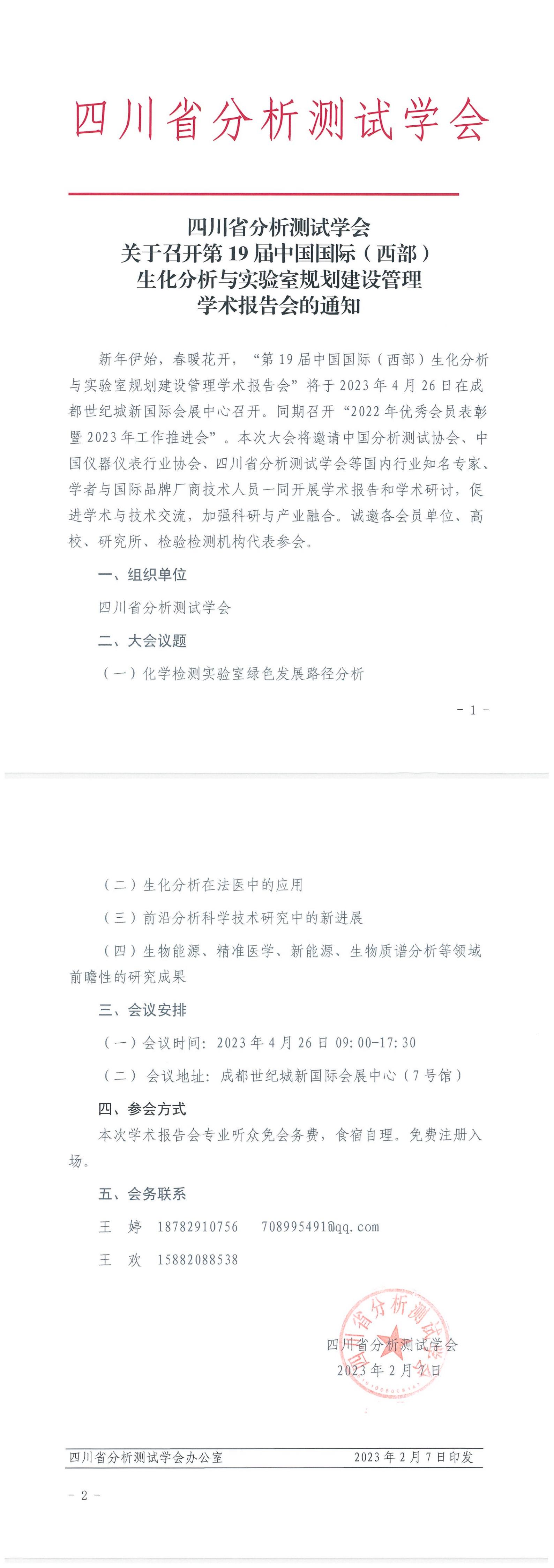 新年伊始,春暖花開,“第19屆中國(guó)國(guó)際(西部)生化分析與實(shí)驗(yàn)室規(guī)劃建設(shè)管理學(xué)術(shù)報(bào)告會(huì)”將于2023年4月26日在成都世紀(jì)城新國(guó)際會(huì)展中心召開。同期召開“2022年優(yōu)秀會(huì)員表彰暨2023年工作推進(jìn)會(huì)”。本次大會(huì)將邀請(qǐng)中國(guó)分析測(cè)試協(xié)會(huì)、中國(guó)儀器儀表行業(yè)協(xié)會(huì)、四川省分析測(cè)試學(xué)會(huì)等國(guó)內(nèi)行業(yè)知名專家、學(xué)者與國(guó)際品牌廠商技術(shù)人員一同開展學(xué)術(shù)報(bào)告和學(xué)術(shù)研討,促進(jìn)學(xué)術(shù)與技術(shù)交流,加強(qiáng)科研與產(chǎn)業(yè)融合。誠(chéng)邀各會(huì)員單位、高校、研究所、檢驗(yàn)檢測(cè)機(jī)構(gòu)代表參會(huì)。