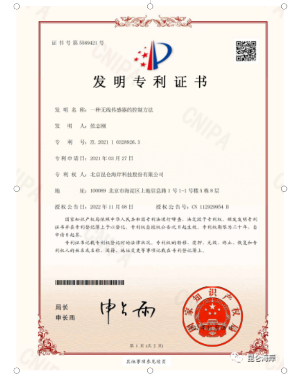 日前,由我司(昆侖海岸)申請的”一種無線傳感器的控制方法”發明專利正式獲得國家知識產權局授權,這標志著昆侖海岸在技術創新和知識產權方面又邁出了重要的一步。