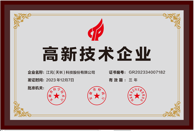 近日,全國高新技術企業認定管理工作領導小組辦公室公布了安徽省認定機構2023年認定報備的第三批高新技術企業備案名單,江元(天長)科技股份有限公司順利通過各部門聯合評審,獲得國家級高新技術企業認證。這是繼兩年前,母公司江元(重慶)科技集團股份有限公司獲得國高認證后,江元集團又一子公司獲得此殊榮。