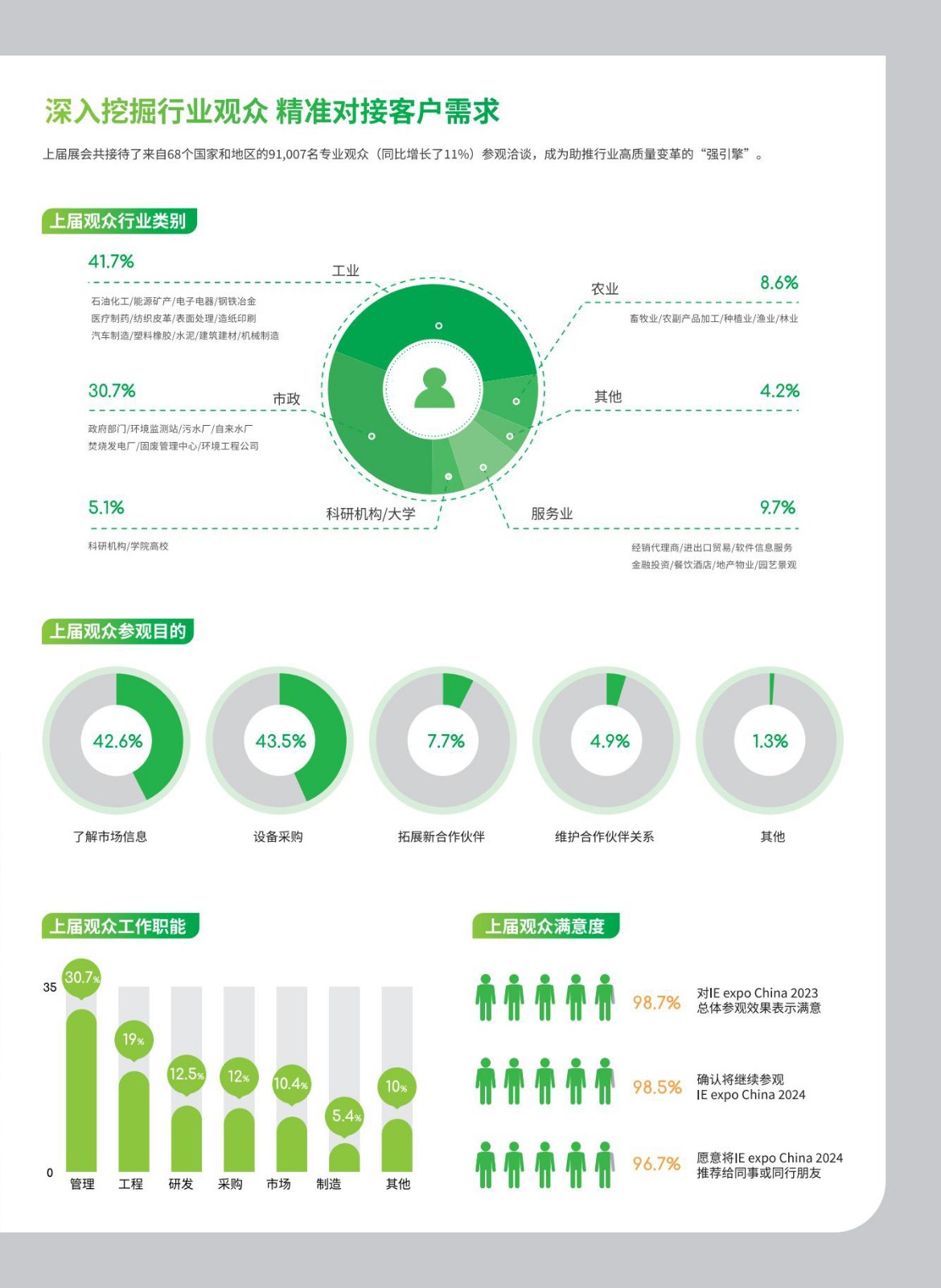 中國環博會(IE expo China)已成長為規模僅次于母展慕尼黑IFAT展的亞洲旗艦生態環境治理領域專業博覽會,是海內外環保企業提升品牌價值、拓展海內外市場、促進技術交流、了解行業趨勢與發掘商機的首選平臺。 第25屆中國環博會將于2024年4月18-20日以全館20萬㎡展示規模繼續在上海新國際博覽中心舉辦,在打通城市、工業與農村生態環境治理全產業鏈解決方案的同時,開設“初創企業、新能源電池回收利用、智慧水務、碳中和”等專區,縱向挖掘產業二次曲線與更多可能性。展會同期還將舉辦"2024中國環境技術會"、"2024碳中和與綠色發展大會"等產業峰會,為行業傳遞前瞻趨勢、尖端技術和創新思維模式,持續推動中國生態環保產業高質量發展。