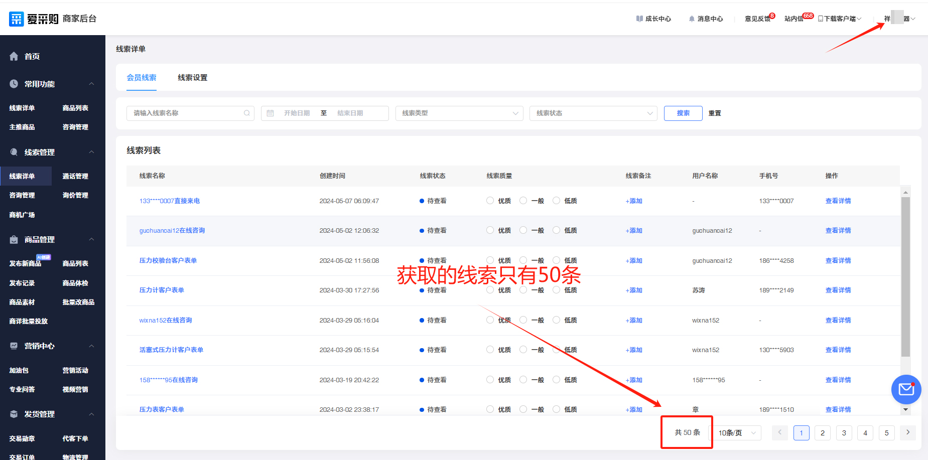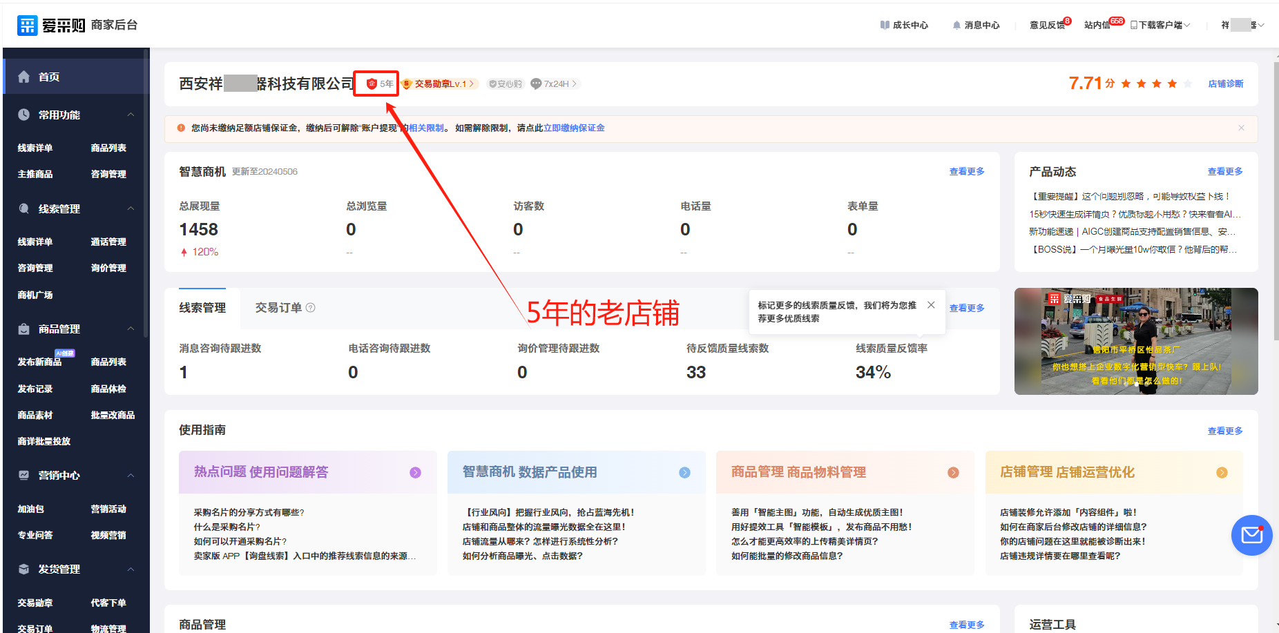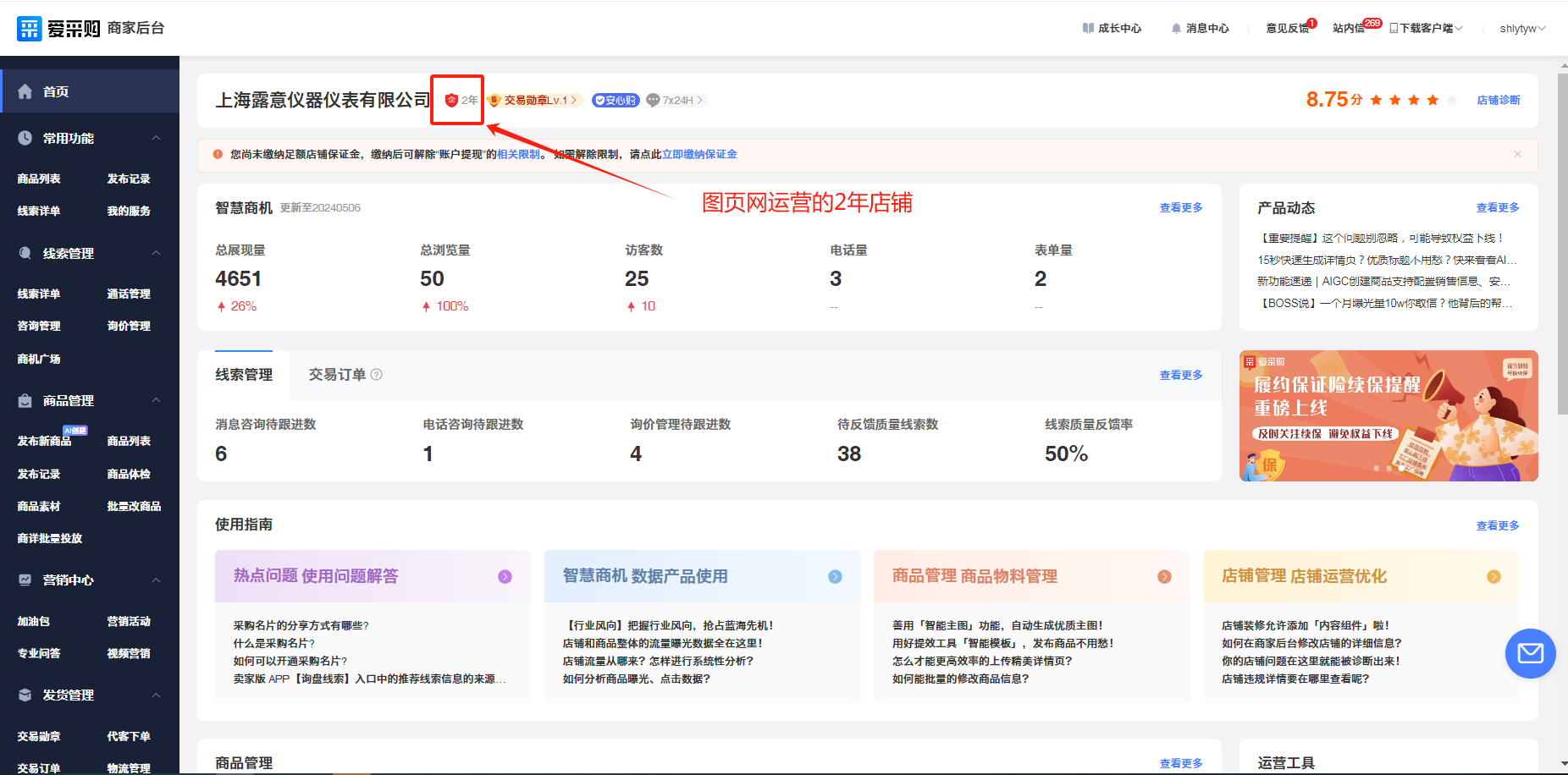 第三張圖片:下圖我們可以看到5年來店鋪的效果是獲取了50條線索,5年是1825天,我們用1825天除以50條線索,36天左右一條線索,所有沒有專業(yè)的運營,愛采購的店鋪效果是起不來的。
