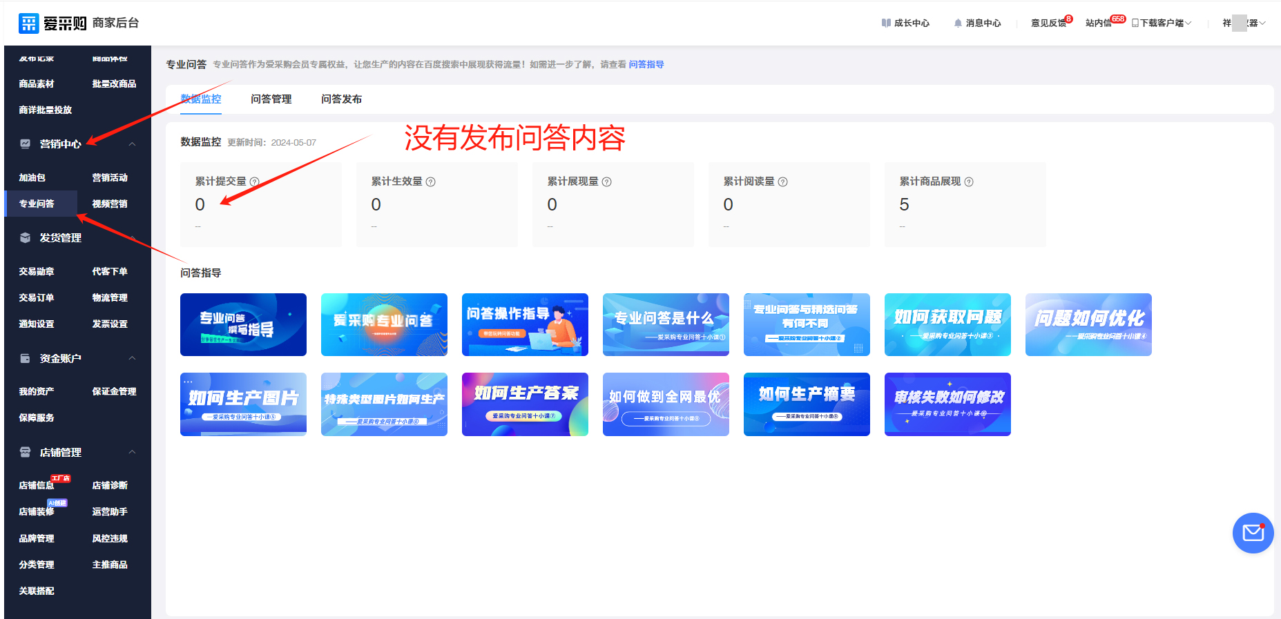 第四張圖片:下圖我們可以看到5年來店鋪沒有發(fā)布一條 專業(yè)問答 內(nèi)容,次運營可以增加愛采購店鋪的分?jǐn)?shù),讓關(guān)鍵詞排名首頁的因素之一,我們圖頁網(wǎng)一個月發(fā)布5-10條專業(yè)問答。