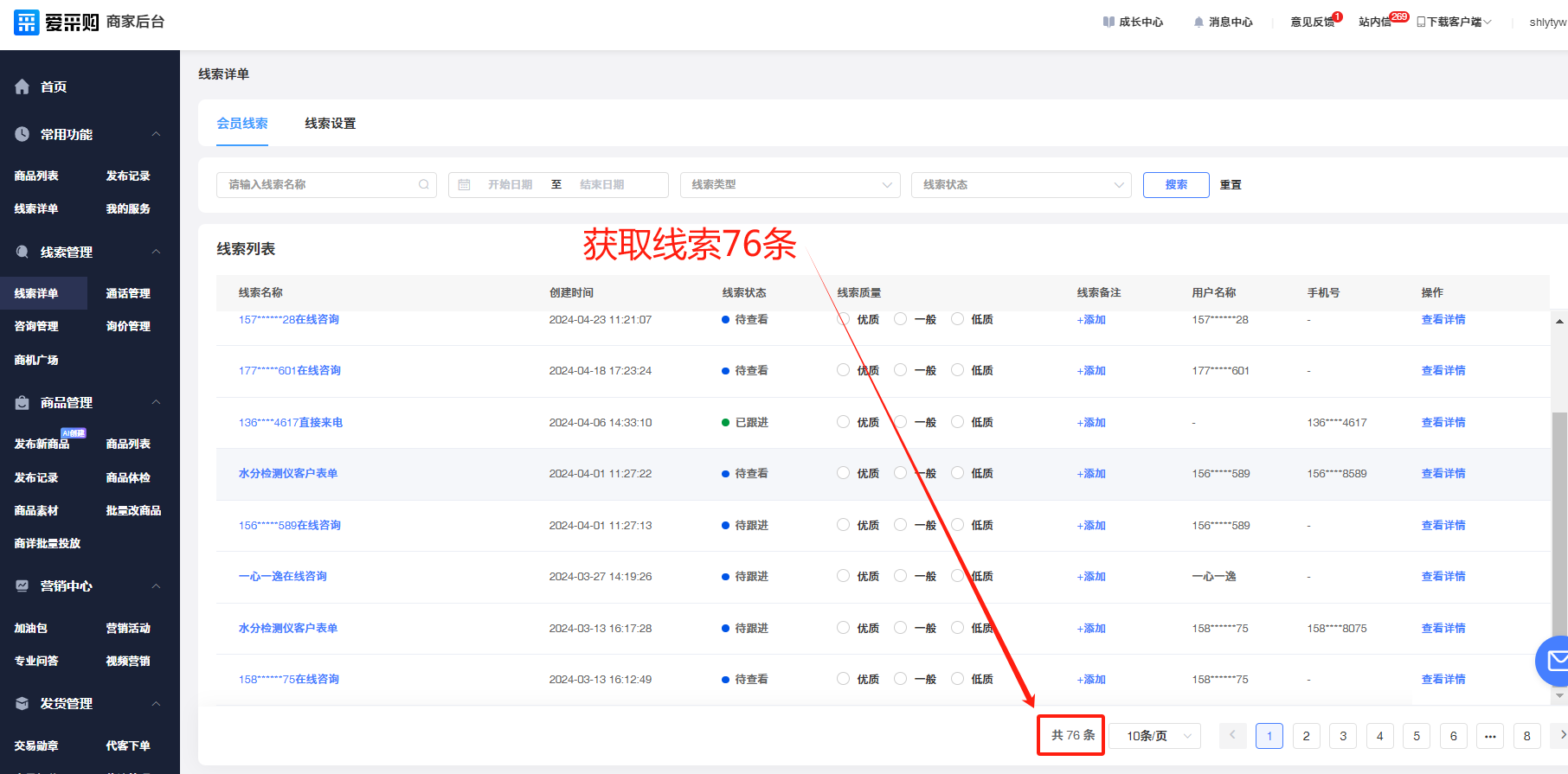 第四張圖片:14個月的愛采購店鋪獲取了76條線索,14個月是420天,我們用420天除以76條線索,5天左右一條線索,與上面相比,水平差距就拉開了,其他服務(wù)商的是35天一條線索。