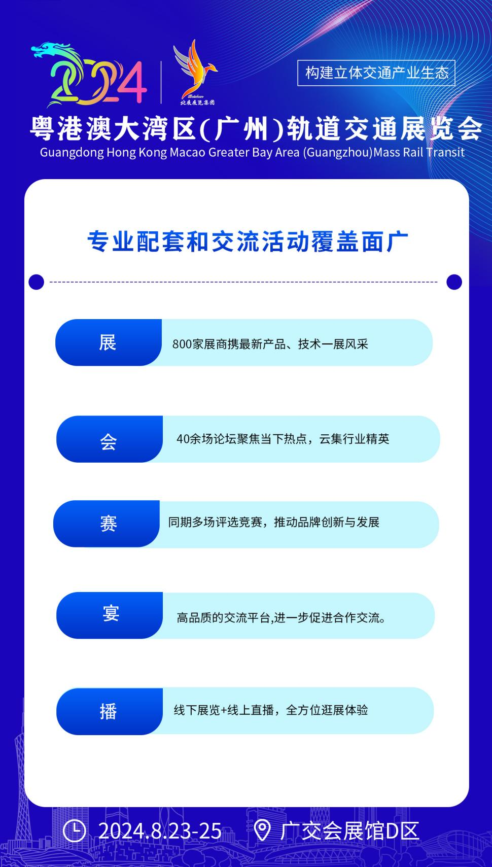 2024年8月23-25日,2024粵港澳大灣區(qū)(廣州)軌道交通展覽會(huì)將在廣州·廣交會(huì)展館D區(qū)舉行。本屆展覽會(huì)以“匯聚新動(dòng)能·共建新生態(tài)”為主題,將舉辦開幕式暨主題論壇、綜合展覽,專業(yè)賽事、成果發(fā)布、成果評(píng)選、產(chǎn)業(yè)對(duì)接等一系列形式多樣的活動(dòng)。