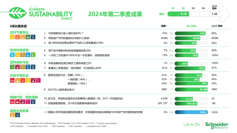 作為施耐德電氣衡量自身可持續發展表現的量化指標體系,“可持續發展影響指數(SSI)”每季度由第三方審計機構評估表現,三年或五年進行更迭。2024年第二季度,施耐德電氣在應對氣候變化、高效利用資源等各方面的表現均有較大幅增長,充分展現其以實際行動完成計劃目標的專業能力與堅定決心。