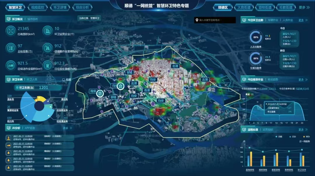 盈峰環境投資2億元自主研發的國內領先環衛全產業鏈大數據云智慧城服平臺,擁有20余項與智慧城服相關的軟件著作權及專利,融合5G、AI、大數據、云計算、邊緣計算等先進技術,以沉浸式的思維形成了物聯網集成應用技術、數據通訊技術、視頻指揮調度技術、安全駕駛檢測技術、物聯網軟硬兼容技術、大數據應用技術等核心技術,對環衛管理所涉及的人、車、物、事進行全過程實時管理。該平臺通過合理規劃設計環衛管理模式,提升環衛作業質量,降低環衛運營成本,以數字評估推動環衛管理實效。目前平臺已為全國超8萬臺產品的客戶提供智能服務,日活用戶突破4萬。