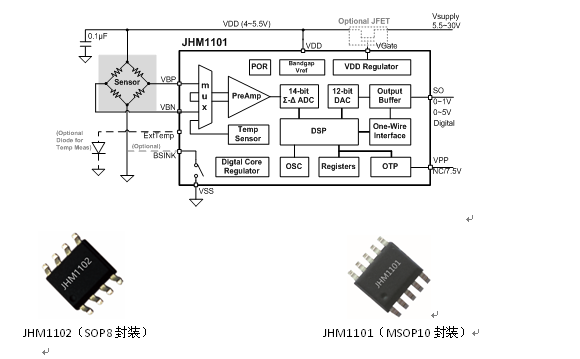 JHM1101是一款針對差分電阻橋式或半橋式傳感器信號設(shè)計的高精度數(shù)字調(diào)理芯片,允許<1mV/V的傳感器信號輸入,可通過單線接口提供數(shù)字或模擬的測量輸出信號,測量周期可達1.1ms。結(jié)構(gòu)框圖如下。可提供裸片、SOP8、MSOP10封裝。