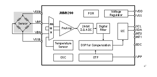 JHM1200是高分辨率24 位Σ△ADC。專門為智能手機、智能手環(huán)、GPS、高度計、氣壓計、運動手表、天氣預(yù)報器等氣壓傳感器應(yīng)用而設(shè)計。工作溫度范圍-40~+85°C,工作電壓1.8~3.6V,傳感器補償后的準確度一般可以小于(±0.1%FSO@-25~+85°C)。結(jié)構(gòu)框圖如下。可提供裸片、MSOP10封裝。