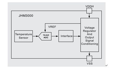 JHM3000是一款針對人體溫度測量的高精度溫度傳感器,它通過兩個引腳的簡單接口與外部連接,以單線數(shù)字通信協(xié)議輸出14bit溫度測量數(shù)據(jù),可以方便地連接各種單片機的GPIO。用戶通過簡單的單個溫度點校準,JHM3000可在32°C~42°C范圍內(nèi)達到±0.1°C的測量精度,溫度分辨率可小于0.01°C。結(jié)構(gòu)框圖如下。可提供裸片。