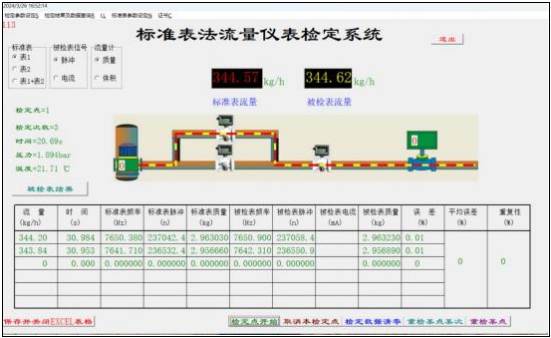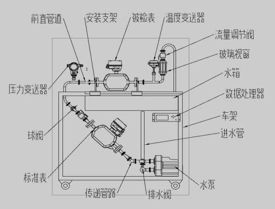該裝置基于流體連續(xù)流原理,以標(biāo)準(zhǔn)表(如渦輪流量計(jì)、渦街流量計(jì)、電磁流量計(jì)、容積式流量計(jì)、科里奧利質(zhì)量流量計(jì)等)為主標(biāo)準(zhǔn)器,在相同時間間隔內(nèi)流體連續(xù)通過標(biāo)準(zhǔn)表和被檢流量計(jì),通過比較兩者的輸出流量值,確定被檢流量計(jì)的計(jì)量性能。根據(jù)液體不可壓縮的原理,在同一管道中任何時刻不同截面處的流量均相等,通過精確測量標(biāo)準(zhǔn)表與被檢表的脈沖信號計(jì)數(shù)及標(biāo)準(zhǔn)表的儀表系數(shù),利用特定公式計(jì)算得出被檢表的儀表系數(shù),從而實(shí)現(xiàn)對被檢流量計(jì)的標(biāo)定。