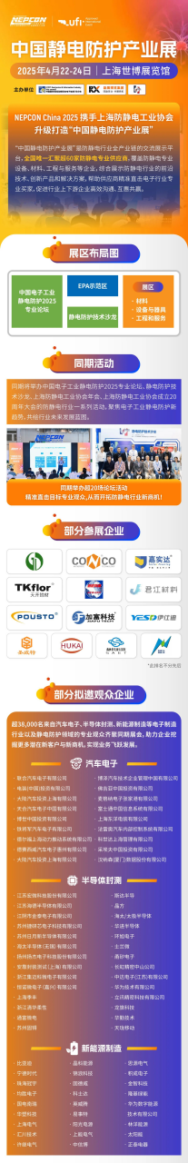 中國靜電防護產業(yè)展將于2025422-24日在上海世博展覽館盛大開幕!本屆展會由NEPCON China與上海防靜電工業(yè)協(xié)會聯(lián)袂主辦,并攜手國內多家權威專業(yè)協(xié)會及機構共同呈現(xiàn),全國唯一匯聚超60家防靜電專業(yè)供應商,覆蓋從設備、材料到器具、工程以及服務等領域,為業(yè)界帶來前沿的技術成果和創(chuàng)新產品展示。