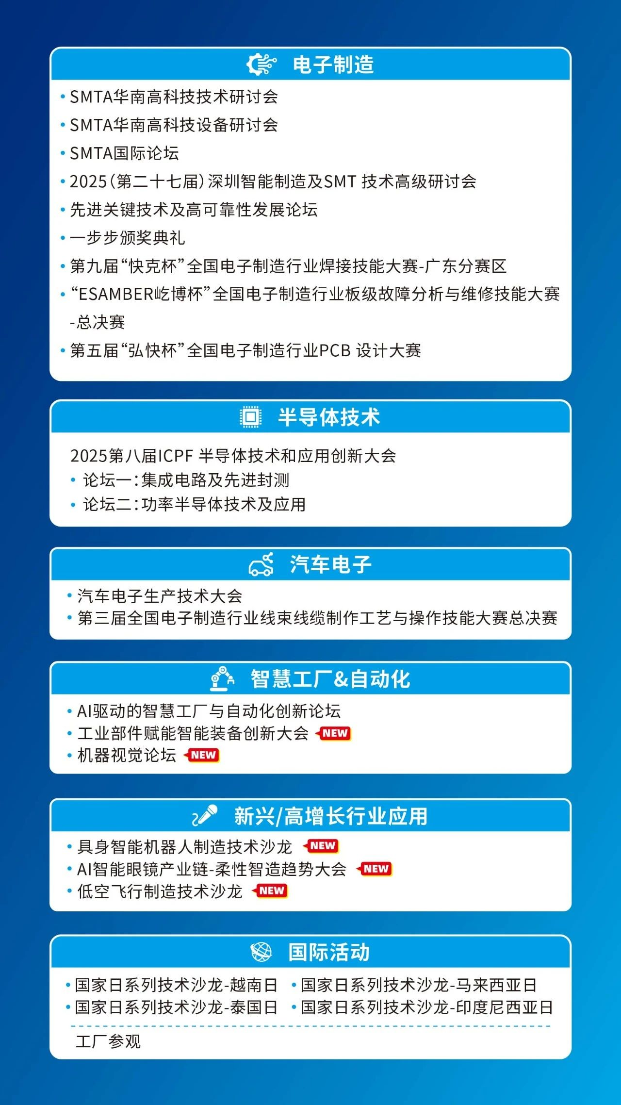 今年以“智鏈電子新生態,跨界全球新商機”為主題,融合時下具身智能機器人、柔性生產、人工智能、半導體、低空飛行等井噴式市場方向,通過百款新品解決方案首發、場景化體驗,細分化主題會議,助力觀眾一站式解決“找供應商、看新技術、優產線、探趨勢、拓視野、尋商機”的觀展需求!