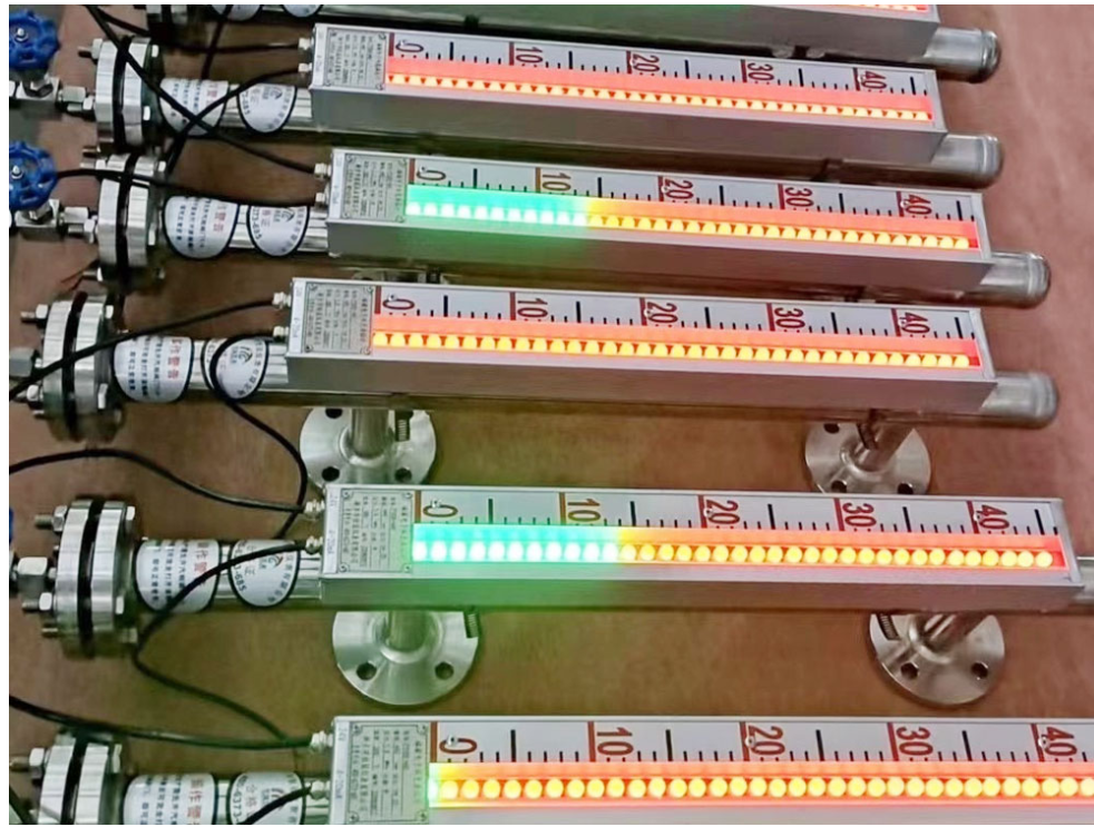 3、液位計安裝完畢后,需用磁鋼進行校正,對磁翻柱導引一次,使零位以下顯示有紅色,零位以上顯示為綠色。