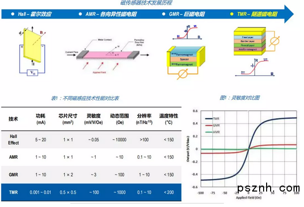 在現有技術中,有許多不同類型的傳感器用于測量磁場和其他參數,例如采用霍爾( Hall)元件,各向異性磁電阻(AMR)元件或巨磁電阻(GMR)元件為敏感元件的磁傳感器。TMR ( Tunnel MagnetoResistance)元件是近年來開始工業應用的新型磁電阻效應傳感器,其利用的是磁性多層膜材料的隧道磁電阻效應對磁場進行感應,比之前所發現并實際應用的AMR 元件和 GMR 元件具有更大的電阻變化率。我們通常也用磁隧道結來代指 TMR 元件, TMR 元件相對于霍爾元件具有更好的溫度穩定性,更高的靈敏度,更低的功耗,更好的線性度,不需要額外的聚磁環結構;相對于 AMR 元件具有更好的溫度穩定性,更高的靈敏度,更寬的線性范圍,不需要額外的 set/reset 線圈結構;相對于 GMR 元件具有更好的溫度穩定性,更高的靈敏度,更低的功耗,更寬的線性范圍.