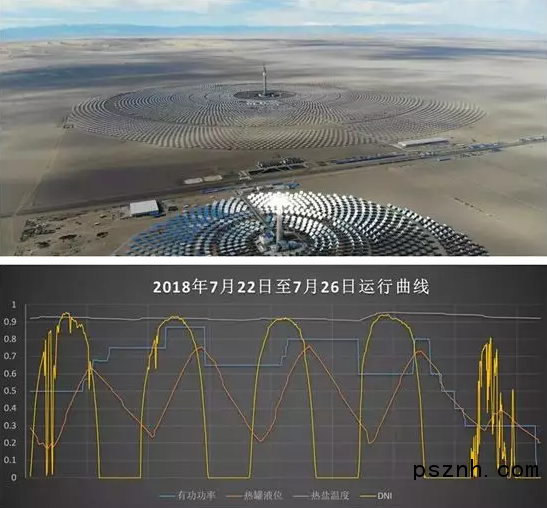 黃文博介紹,今年7月,敦煌有7天為多云天氣,電站在部分時(shí)段冷鹽上塔集熱,5天為完全陰天,完全未上塔集熱,其余19天為晴天,熔鹽完全上塔集熱。在這一個(gè)月中,共加熱熱鹽151小時(shí),加熱冷鹽44小時(shí)。