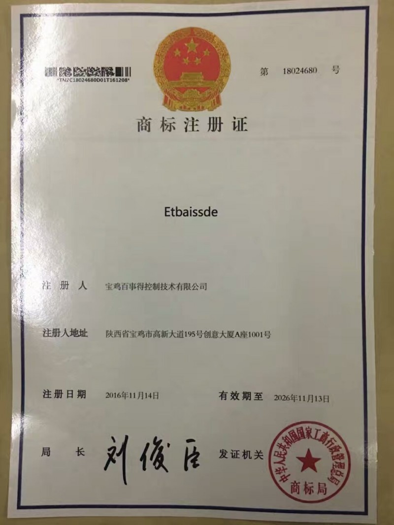 熱烈祝賀歷時一年半寶雞百事得控制技術有限公司申請注冊的“Etbaissde”商標,獲得中華人民共和國國家工商行政管理總局商標局核準注冊成功。
