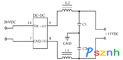 一種是直流電源DC/DC隔離模塊的使用,如下圖所示,26V直流電源輸入,產(chǎn)生+15V的隔離電源輸出。