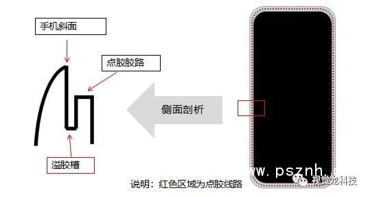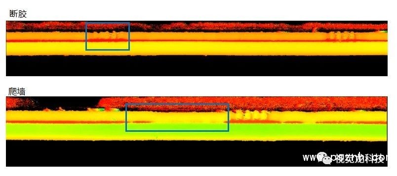 爬墻:溢膠槽中膠水過多導致高度值過高,而點膠膠路上的膠水很少,膠路上的膠高低于溢膠槽中的膠高且低于基準值時,物料判定為爬墻。