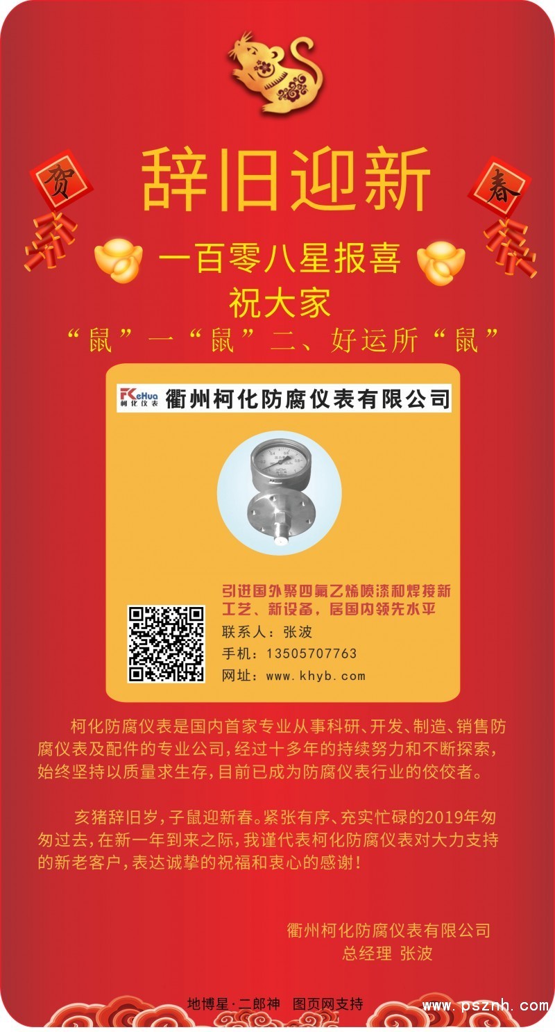 亥豬辭舊歲,子鼠迎新春。緊張有序、充實忙碌的2019年匆匆過去,在新一年到來之際,我謹代表柯化防腐儀表對大力支持的新老客戶,表達誠摯的祝福和衷心的感謝!