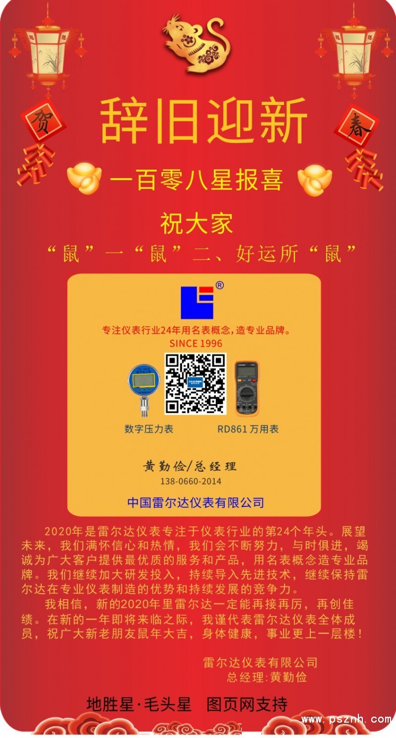 我相信,新的2020年里雷爾達一定能再接再厲,再創佳績。在新的一年即將來臨之際,我謹代表雷爾達儀表全體成員,祝廣大新老朋友鼠年大吉,身體健康,事業更上一層樓!