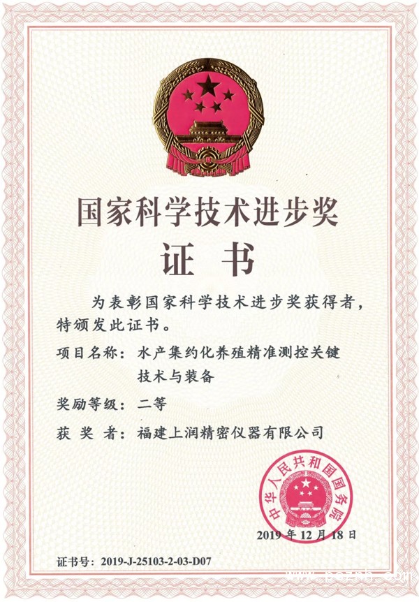 2020年1月10日,2019年度國家科學技術獎勵大會在北京人民大會堂舉行,共評選出296個項目和12名科技專家。其中,國家最高科學技術獎2人;國家自然科學獎46項,其中一等獎1項、二等獎45項;國家技術發明獎65項,其中一等獎3項、二等獎62項;國家科學技術進步獎185項,其中特等獎3項、一等獎22項、二等獎160項;授予10名外籍專家中華人民共和國國際科學技術合作獎。由福建上潤主要參與完成的《水產集約化養殖精準測控關鍵技術與裝備》項目獲得2019年度國家科學技術進步獎二等獎。