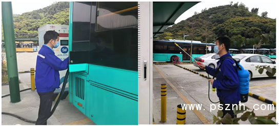 (左:工作人員正在為大巴充電,右:工作人員正在為充電場站進行消殺)