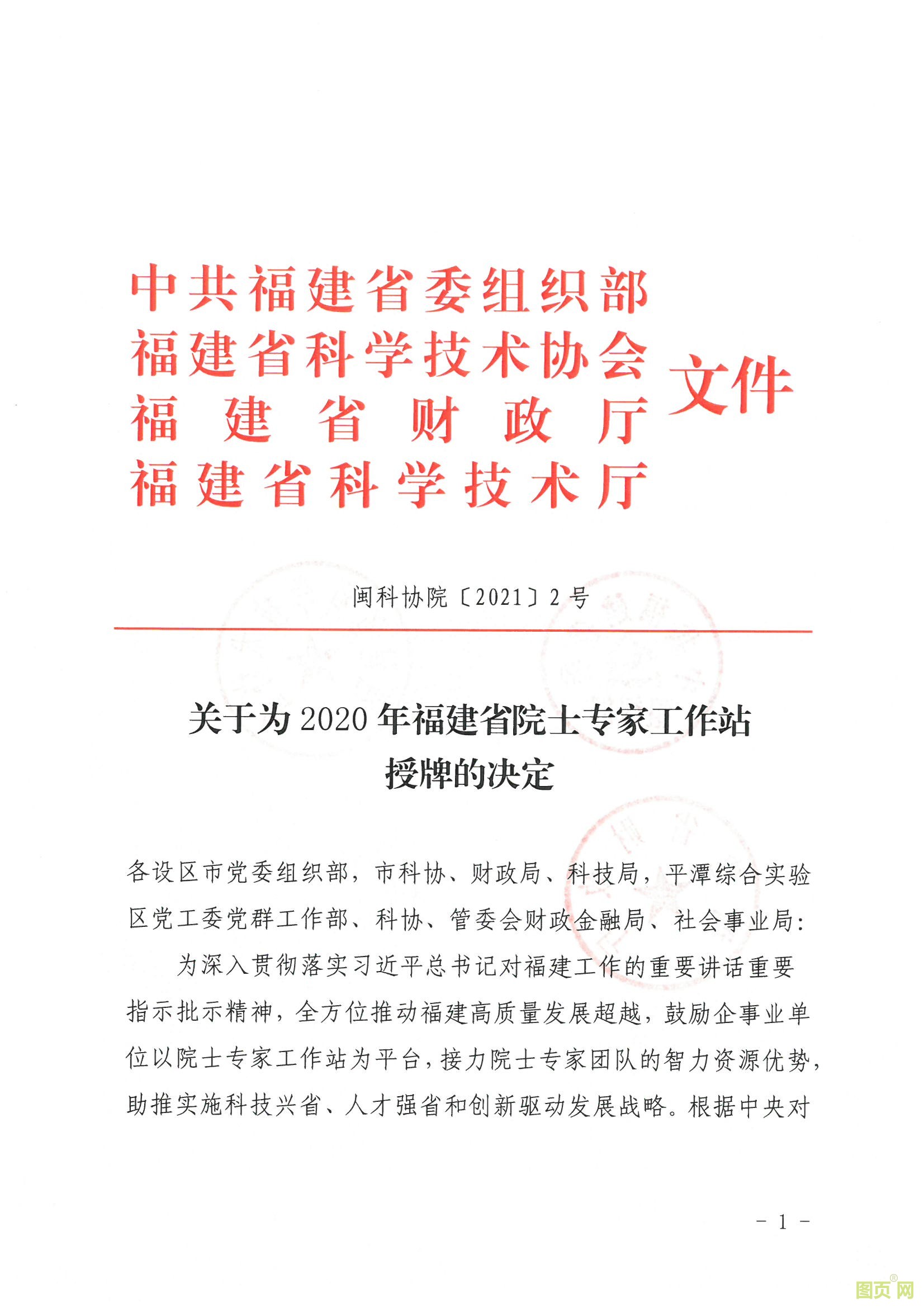 近日,中共福建省省委組織部、福建省科學技術協會、福建省財政廳、福建省科學技術廳聯合頒發了閩科協院[2021]2號《關于為2020年福建省院士專家工作站授牌的決定》文件,為全省22家院士專家工作站進行再次授牌。虹潤院士專家工作站也榮膺此列,為南平地區唯一獲得再次授牌的院士專家工作站。