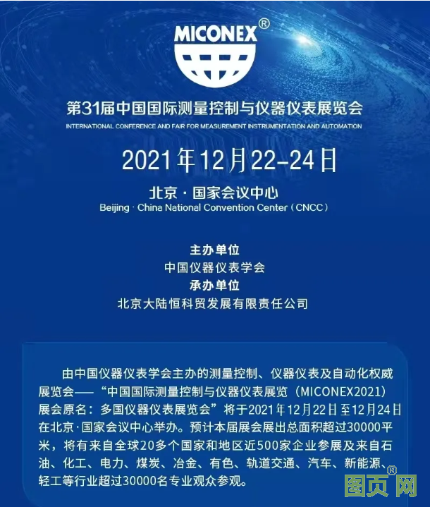 由中國儀器儀表學會主辦的測量控制、儀器儀表及自動化權威展覽會——“中國國際測量控制與儀器儀表展覽(MICONEX2021)展會原名:多國儀器儀表展覽會”將于2021年12月22日至12月24日在北京·國家會議中心舉辦,本屆展會將為全球測量控制與儀器儀表生產(chǎn)商和用戶提供了展示和交流的平臺。