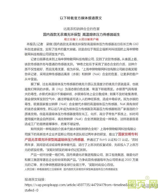 轉載《人民日報》客戶端報道:國內首款無汞填充環保型高溫熔體壓力傳感器誕生