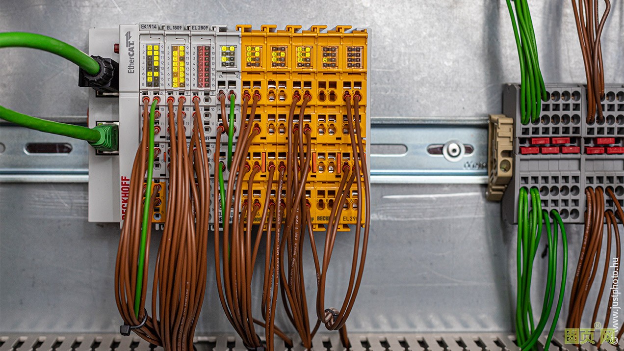 EtherCAT 和 TwinSAFE 端子模塊安裝在控制柜中,用于控制管弦樂池
