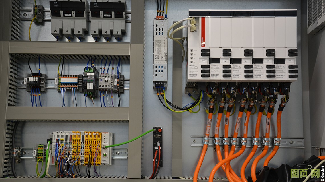配備 AX8000 多軸伺服驅動系統的控制柜(右),EtherCAT 和 TwinSAFE 端子模塊(左下)以及防護等級為 IP67 的 EPP1322-001 EtherCAT P 拓撲擴展模塊(中下)