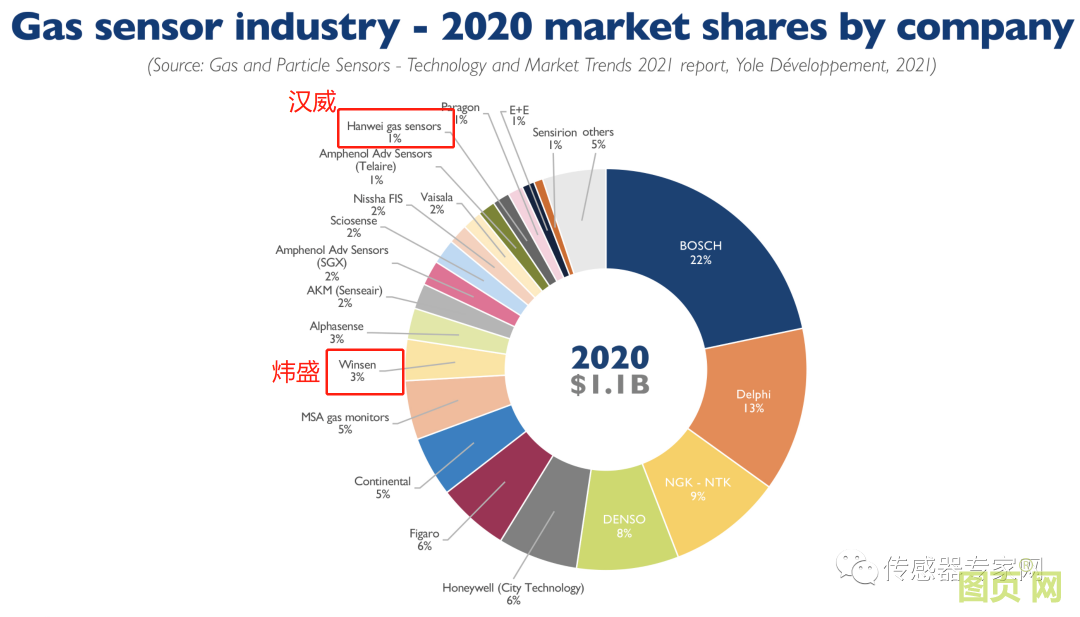漢威科技是國內最早從事氣體傳感器研究、生產的廠家之一,目前漢威科技已經成為中國最大的氣體傳感器廠商,產銷量占國內氣體傳感器市場75%,市場份額方面,根據Yole的數據顯示,漢威科技(含旗下煒盛電子)占全球氣體傳感器市場份額的4%,也是中國唯一進入全球市場份額榜單的公司,漢威科技每年為全球近百個國家和地區提供各類傳感器及模組超3000萬支。