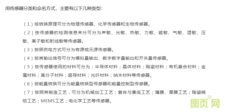 美國國家科學發展基金會認為,本世紀的重大變革就是:通過網絡,把物質世界聯接起來,并賦予它一個電子神經系統,使它具有能夠感知信息的生命,而能夠擔當這一重任的核心就是傳感器”。每年度財政預算約有69億美元,用于傳感器基礎技術與應用研究,稱其為“Sensor Revolution”(即:傳感器革命)。 目前國際上缺乏制定國際標準的準則與規范,尚未制定出權威性的傳感器標準類型。只能劃分為簡單的物理傳感器、化學傳感器和生物傳感器等大的類別。 例如,物理傳感器有:聲、力、光、磁、溫、濕、電、射線等等;化學傳感器有:各種氣敏、酸堿PH值、離子化、極化、化學吸附、電化學反應等現象等等;生物傳感器有:酶電極和介體生物電等等。在產品用途和形成過程中的因果關系互相咬合,既不能劃分到物理類,也不能劃分為化學類,難以嚴格劃分。