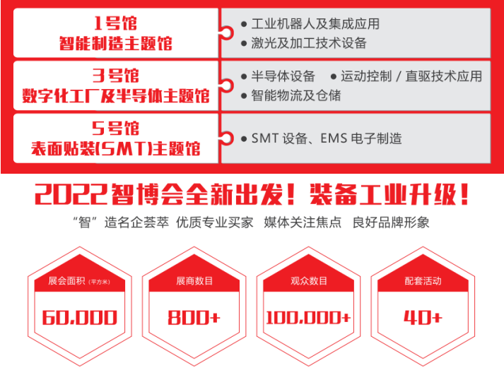 ⑦三個館展出主題不同:1號館(智能制造主題館:以工業機器人及集成運用、激光及加工技術設備為主)、3號館(數字化工廠及半導體主題館:以半導體設備、工控核心零部件及運動控制 、智能物流及倉儲為主)、5號館(表面貼裝SMT主題館:以SMT設備、EMS電子制造為主);