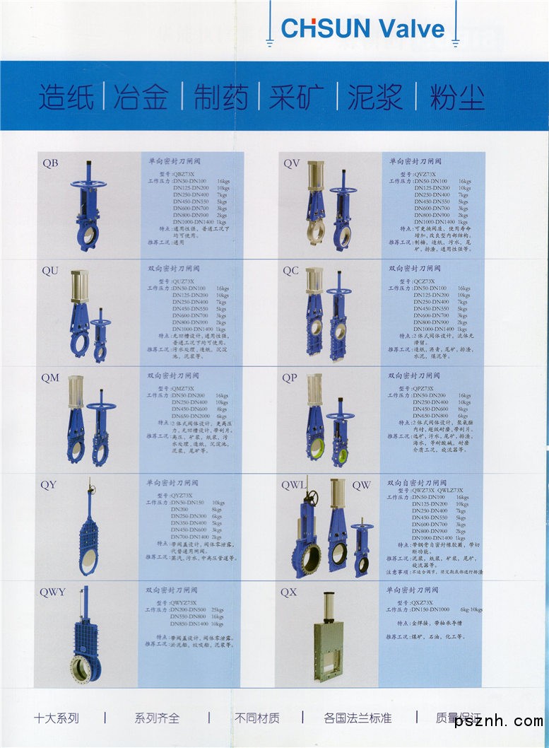 公司專業(yè)生產(chǎn)刀閘閥、V型球閥、眼睛閥、蝶閥、O型球閥、全焊接球閥、半球閥、閘門啟閉機(jī)等各種電動、氣動、手動閥門等90個系列,2800多種規(guī)格品種。廣泛應(yīng)用于造紙、化纖、石化、食品、冶金、電力、制藥、污水處理等行業(yè)的自動化控制系統(tǒng)。公司生產(chǎn)的無磨擦區(qū)域金屬密封刀閘閥試壓超出美國MSS-SP、81泄漏標(biāo)準(zhǔn),產(chǎn)品鑒定評為國際先進(jìn)水平,獲國家二十項專利、國家重點新產(chǎn)品、國家火炬計劃項目。目前公司的控制閥系列產(chǎn)品,已被廣泛應(yīng)用到國內(nèi)外大型造紙項目中,產(chǎn)品已出口到美國、澳大利亞、印尼、西班牙、臺灣、意大利等國家。產(chǎn)品執(zhí)行GB國家標(biāo)準(zhǔn)、API美國石油協(xié)會標(biāo)準(zhǔn)、AISI美標(biāo)、JIS日標(biāo),DIN德標(biāo)。公司擁有ISO:2000質(zhì)量體系認(rèn)證、美國石油學(xué)會API認(rèn)證、歐盟CE認(rèn)證,符合壓力容器TS標(biāo)準(zhǔn)。