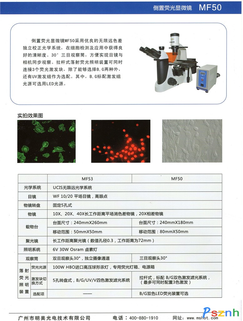 公司主要產品有:專業級數碼攝像頭MC55、MC50、MC20、MD55、MD90、MD50;MSHOT數碼顯微鏡系列;大體標本成像儀;體視熒光顯微鏡;顯微鏡相機接口及配件等。產品廣泛應用于高校、研究所、企事業單位實驗室。目前廣州市明美光電技術有限公司能為國內外客戶提供詳細的顯微鏡成像售前咨詢,樣品實測,以及全面的顯微觀測解決方案,同時公司具有完善的售后服務體系,可以提供及時快捷的顯微數碼成像產品技術支持,維修服務。