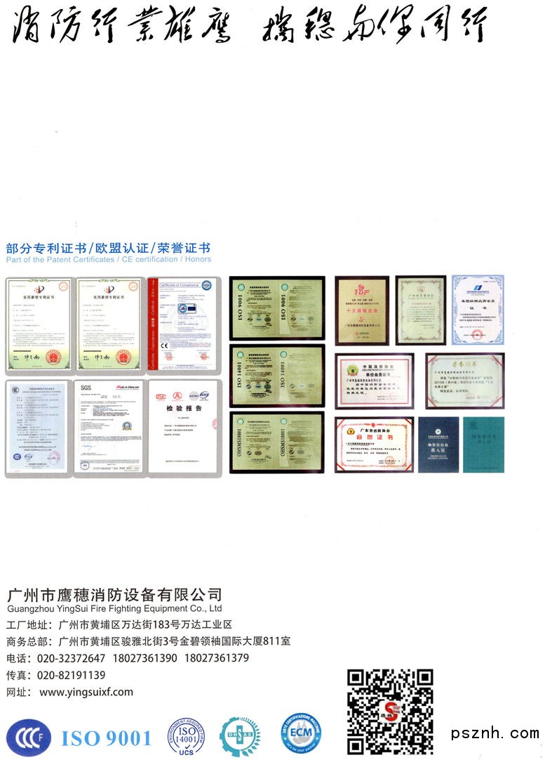 廣州市鷹穗消防設備有限公司是專業(yè)生產(chǎn)、銷售各類消防設備、器材為主,集科研、制造、成套設備供應、國際貿(mào)易、設計、施工安裝、維保為一體。產(chǎn)品通過“國家固定滅火系統(tǒng)和耐火構件質(zhì)量監(jiān)督檢驗中心”的型式檢驗。 我公司的消防產(chǎn)品主要分為: